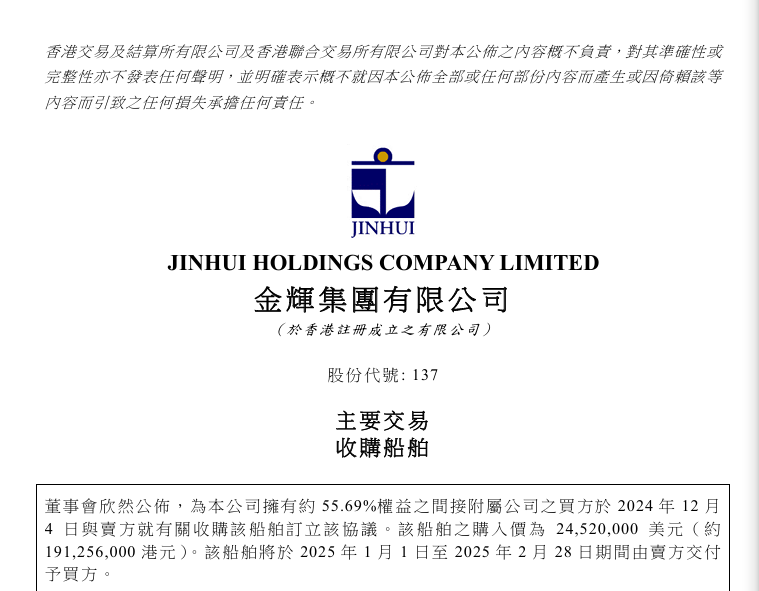 The contract price for each vessel was US$33,050,000 (approximately HK$257,790,000), for a total of US$99,150,000 (approximately HK$773,370,000), payable in US dollar cash. 70% of the payment is expected to be financed by bank financing, with the remainder funded from the group’s internal resources. The three vessels will be delivered by January 31, February 29, and March 31, 2028, respectively.