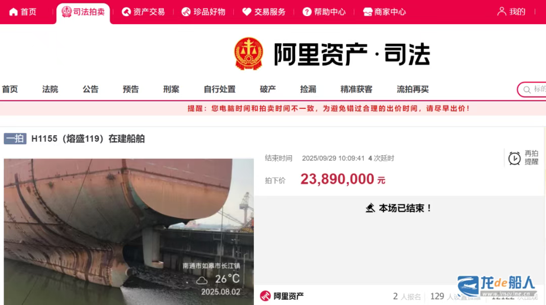 According to the official website of the Alibaba Asset Auction Platform, Fujian Huanhang Shipping Co., Ltd. successfully acquired the vessel Rongsheng 119 (Hull No.H1155) under construction for RMB 23.89 million (approximately $3.3542 million), representing a direct reduction of RMB 5.34 million from the appraised value.