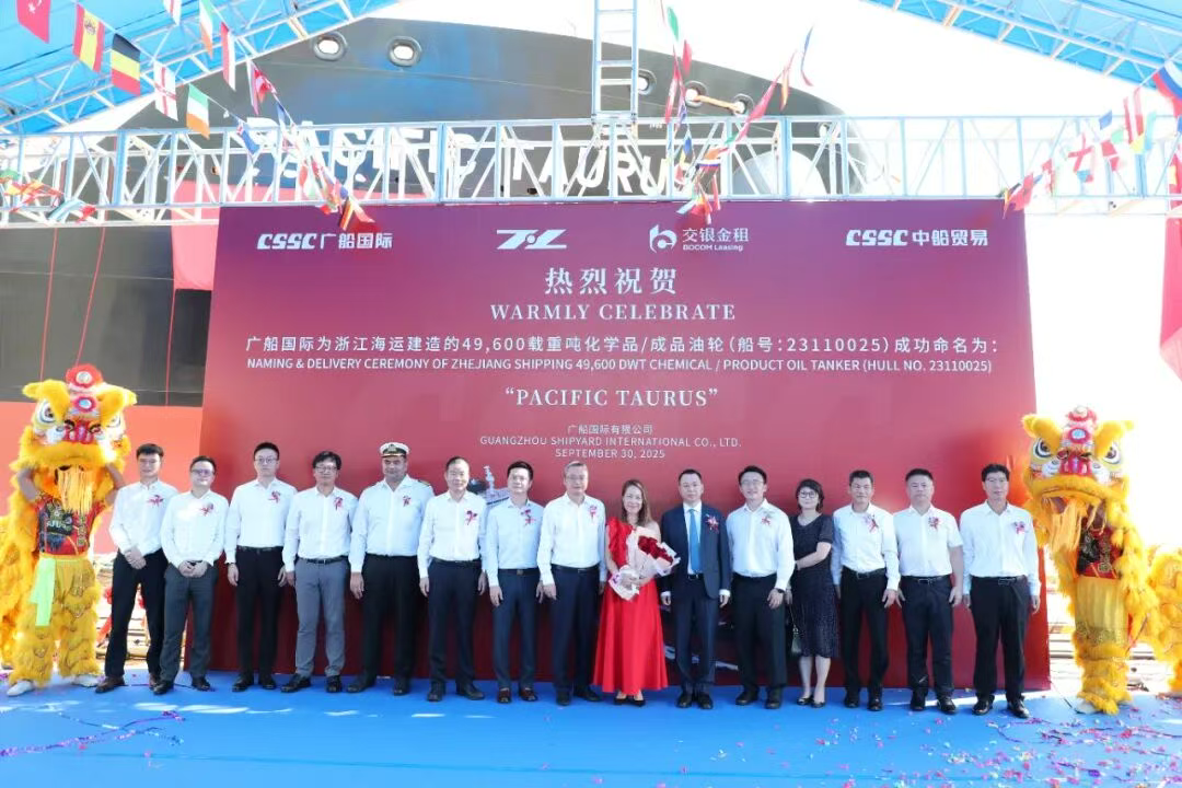 On September 30, Guangzhou Shipyard International (GSI), a subsidiary of China State Shipbuilding Corporation (CSSC), held the naming and delivery ceremony for the 49,600 DWT chemical tanker “PACIFIC TAURUS” (the first vessel of its series) built for Zhejiang Shipping Group. The naming and delivery of this vessel marks a historic breakthrough for Zhejiang Shipping Group in its liquid bulk fleet development—moving from “zero to one”—and represents a crucial step taken by Zhejiang Shipping in the liquid bulk sector.