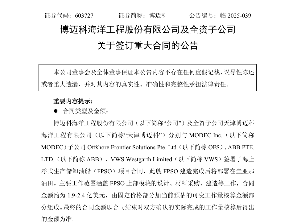 The announcement disclosed that BOMECO and its wholly-owned subsidiary, Tianjin BOMECO Offshore Engineering Company Limited (Tianjin BOMECO), have signed contracts for an offshore floating production, storage and offloading (FPSO) vessel project with Offshore Frontier Solutions Pte. Ltd. (OFS), a subsidiary of MODEC Inc. (MODEC), ABB Pte. LTD. (ABB), and VWS Westgarth Limited (VWS). The contract value is approximately US$190 million to US$240 million. Upon completion, the FPSO will be deployed in the Guyana oil fields.