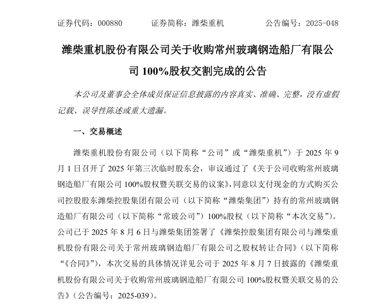On October 8, Weichai Heavy Machinery Co., Ltd. (hereinafter referred to as “Weichai Heavy Machinery”) issued the “Announcement on the Completion of the Acquisition of 100% Equity of Changzhou FRP Shipyard Co., Ltd”.
