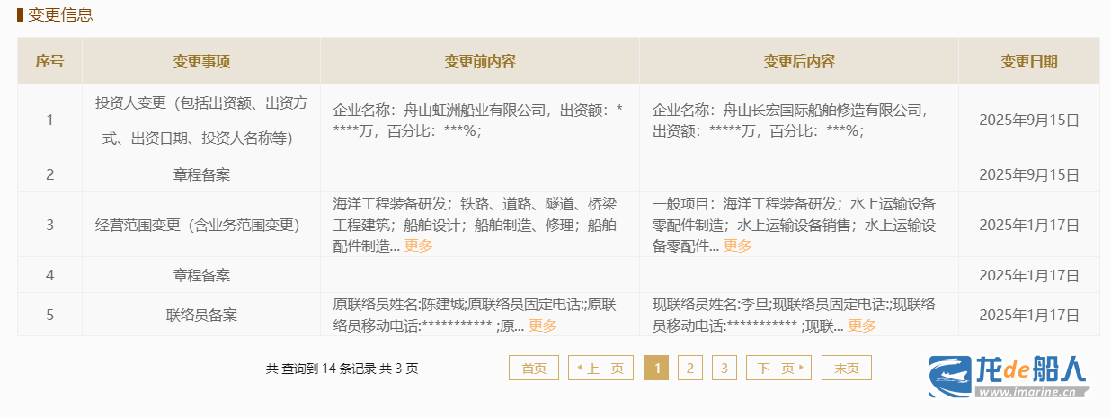 According to the National Enterprise Credit Information Publicity System, Zengzhou Heavy Industry’s controlling shareholder has changed. The change information column indicates that on September 15, 2025, Zengzhou Heavy Industry’s investor (including investment amount, investment method, investment date, and investor name) changed from Zhoushan Hongzhou Ship Building Co., Ltd. to Zhoushan Changhong International.