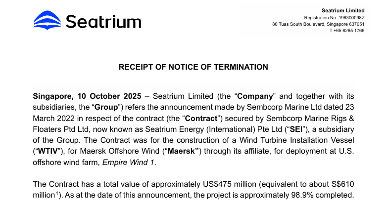 On October 10, Singapore-based offshore shipbuilder Seatrium announced that it received a notice of termination on October 9, 2025. The notice concerned a contract for the construction of a wind turbine installation vessel (WTIV) signed between Sembcorp Marine Rigs & Floaters, a subsidiary of the former Sembcorp Marine and Maersk Offshore Wind.