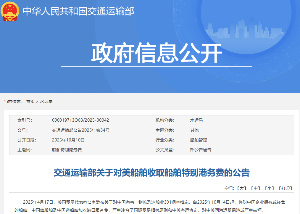 On October 10, China’s Ministry of Transport issued an announcement regarding the imposition of special port fees on U.S. vessels. The announcement stated that effective October 14, special port fees would be levied on U.S. vessels.