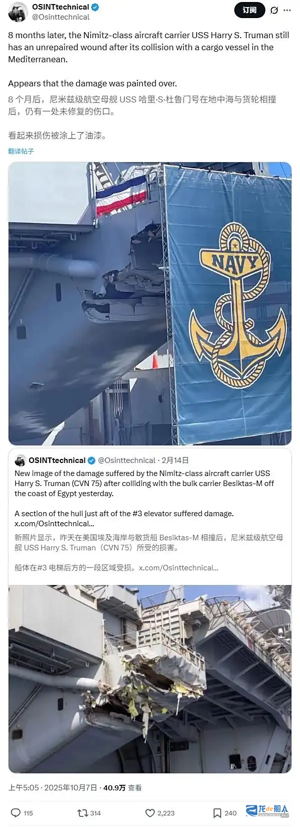 Public information indicates that the USS Harry S. Truman was damaged in a collision with the cargo vessel M/V Besiktas-M in the Mediterranean Sea off the Egyptian coast in February of this year. Approximately a week after the collision, the USS Harry S. Truman completed Emergency Repair Availability (ERAV) repairs at the Greek port of Souda Bay and returned to sea for routine operations. The ship arrived at Souda Bay on February 16th, completed damage assessments, and resumed operations after emergency repairs.