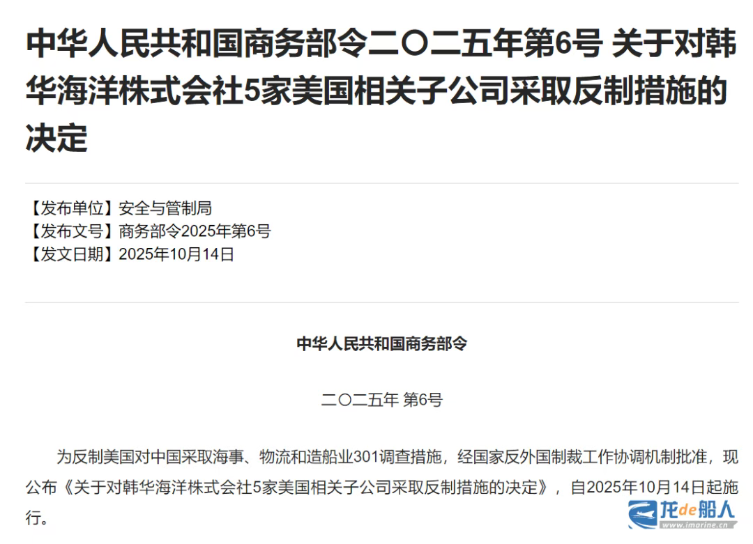 In response to the U.S. Section 301 investigation targeting China’s maritime, logistics, and shipbuilding industries, China’s Ministry of Commerce announced on October 14 countermeasures against five U.S.-related subsidiaries of Hanwha Ocean, effective October 14, 2025.