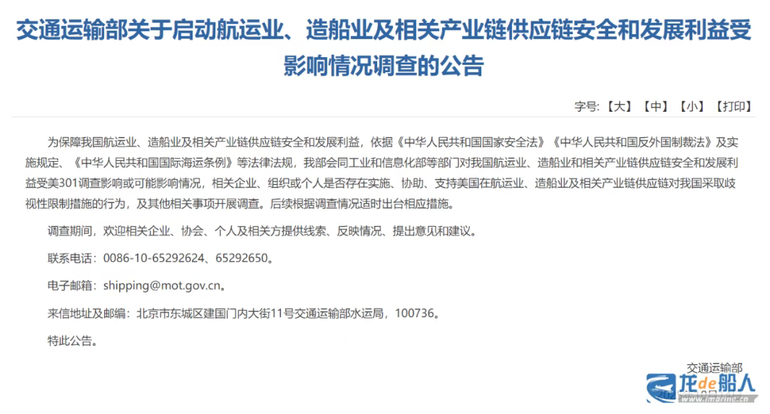 In accordance with the announcement, to safeguard the security and development interests of China’s shipping industry, shipbuilding industry, and related industrial and supply chains, the Ministry of Transport, together with the Ministry of Industry and Information Technology and other relevant departments, will conduct an investigation into the following matters: the impact or potential impact of the U.S. Section 301 Investigation on the security and development interests of China’s shipping industry, shipbuilding industry, and related industrial and supply chains; whether relevant enterprises, organizations or individuals have engaged in acts of implementing, assisting in or supporting the U.S. discriminatory restrictive measures against China in the shipping industry, shipbuilding industry, and related industrial and supply chains; and other related matters. Corresponding measures will be introduced in a timely manner based on the investigation results in the follow-up.