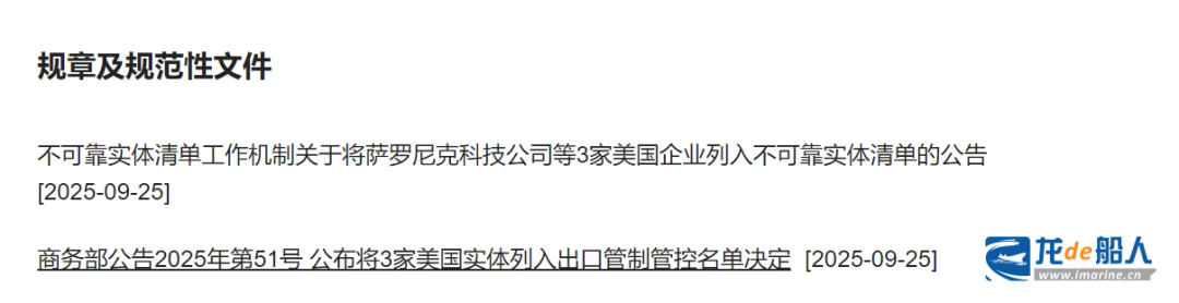 On September 25, China’s Ministry of Commerce announced that it had added three U.S. companies to its list of unreliable entities and placed three U.S. entities under export control restrictions. Among them are three shipbuilding-related companies: Huntington Ingalls Industries, Inc., Saronic Technologies, Inc., and Oceaneering International, Inc..