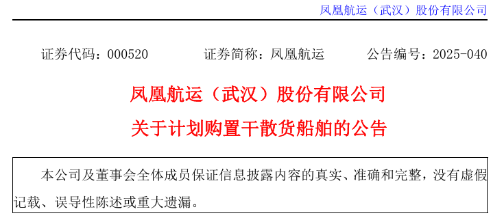 On October 14, Phoenix Shipping (Wuhan) Co., Ltd. issued the “Announcement on the Plan to Purchase Dry Bulk Cargo Vessels”.