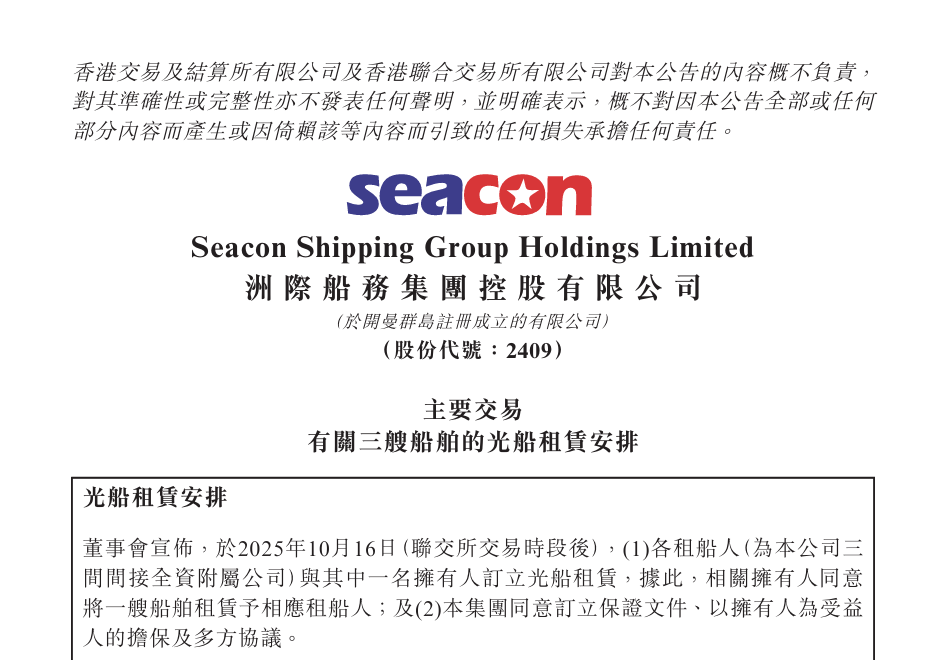 On October 16, Seacon Shipping Group Holdings Limited (hereinafter referred to as “Seacon Shipping”) issued the “Bareboat Charter Arrangements for Three Vessels Related to Major Transactions”.