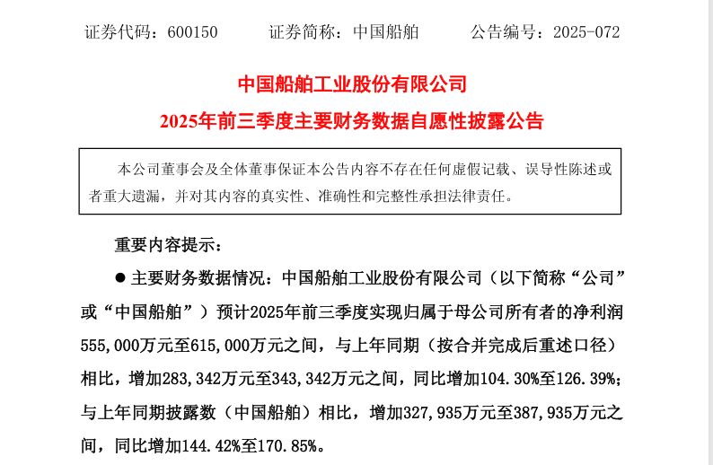 The announcement disclosed that CSSC expects to achieve a net profit attributable to shareholders of RMB 5.55 billion to RMB 6.15 billion (approximately US$780 million to US$864 million) in the first three quarters of 2025, a year-on-year increase of 104.30% to 126.39%; it expects to achieve a net profit attributable to shareholders of RMB 4.08 billion to RMB 4.68 billion (approximately US$573 million to US$658 million), a year-on-year increase of 106.93% to 137.36%.