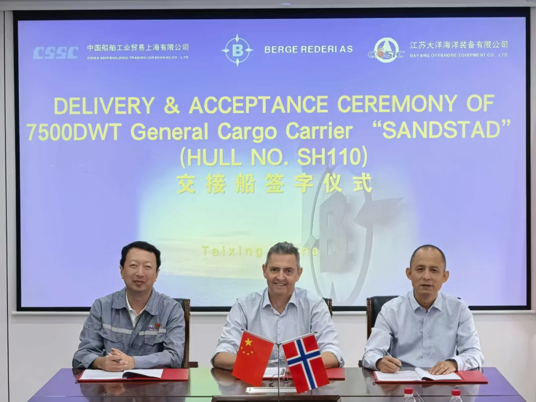 Recently, Jiangsu Dayang Marine Equipment Co., Ltd.(DYOE) held a signing and delivery ceremony for the 7,500 DWT general cargo vessel SANDSTAD, built for Norway’s Berge Group.