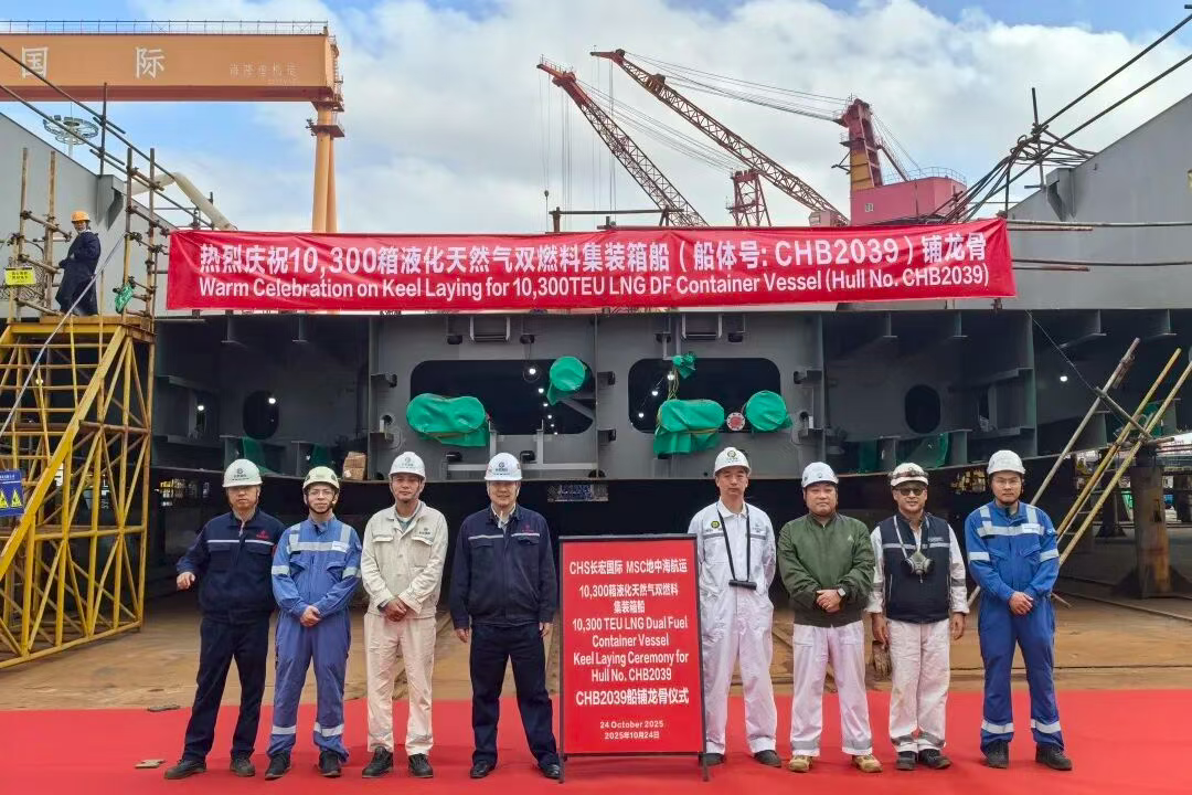On October 24, China’s Zhoushan Changhong International held the keel-laying ceremony for the third 10,300 TEU LNG dual-fuel container ship (Hull NO.CHB2039) under construction for MSC at Dock No. 1. This milestone marks the official transition of the vessel’s construction into the critical in-dock outfitting phase, laying a solid foundation for the project’s subsequent smooth progress.