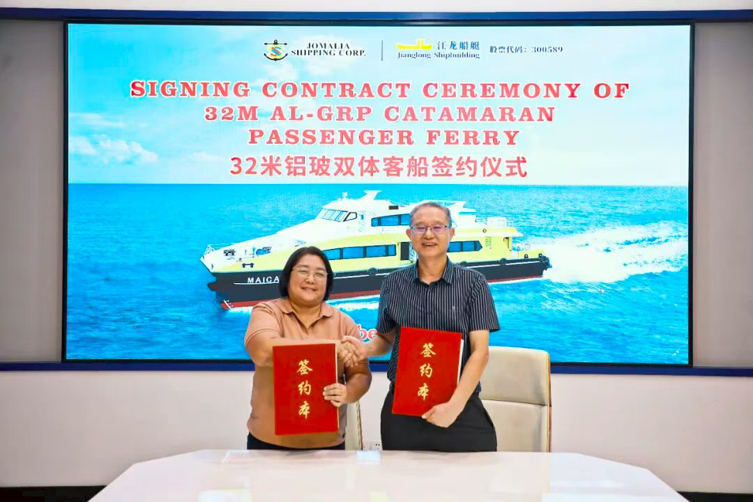 China’s Jianglong Shipbuilding announced that on October 24, it renewed its partnership with JOMALIA SHIPPING CORP. of the Philippines by signing a contract for two 32-meter/198-passenger catamaran passenger ferries, further deepening the cooperative relationship between the two parties.