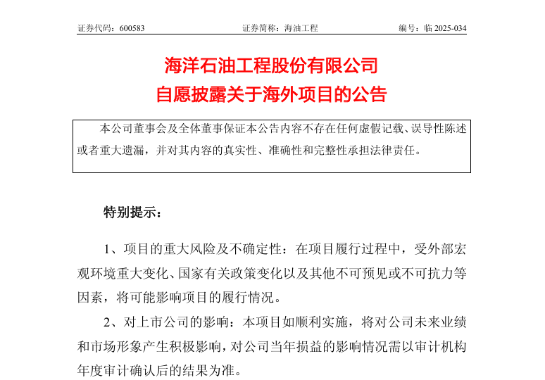 On October 24, China Offshore Oil Engineering Co., Ltd. (hereinafter referred to as “COOEC”) issued the “Voluntary Disclosure Announcement Regarding Overseas Projects”.