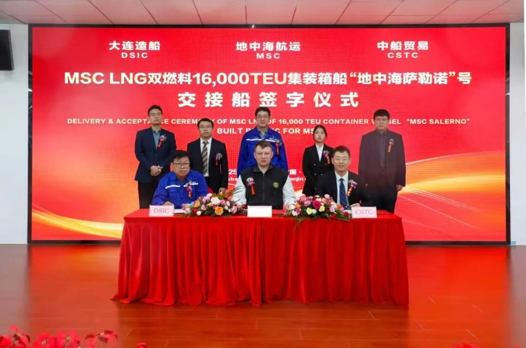 On October 30th, CSSC (Tianjin) Shipbuilding – a subsidiary of Dalian Shipbuilding Industry Corporation (DSIC) – successfully delivered the 16,000 TEU LNG dual-fuel container vessel “MSC Salerno” to Mediterranean Shipping Company (MSC), 93 days ahead of the contractual delivery schedule.