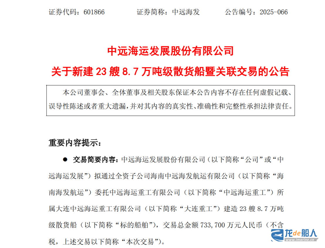 According to COSCO SHIPPING Development’s announcement regarding the construction of 23 new 87,000 DWT bulk carriers and related party transactions, COSCO SHIPPING Development plans to commission COSCO SHIPPING Heavy Industry (Dalian), a subsidiary of COSCO Shipping Heavy Industry, to build 23 87,000 DWT bulk carriers through its wholly-owned subsidiary, Hainan COSCO Shipping Development. The total transaction amount is RMB 7,337 million (excluding tax, approximately US$1.032 billion). The first vessel is expected to be delivered on or before May 20, 2027, with the others to be delivered successively before the end of 2028.