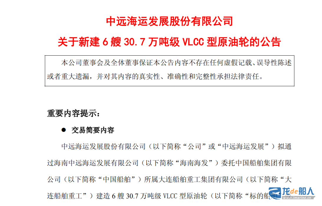 According to an announcement by COSCO SHIPPING Development regarding the construction of six new 307,000 DWT VLCCs, COSCO SHIPPING Development plans to commission DSIC through Hainan COSCO Shipping Development to build six 307,000 DWT VLCCs. The total transaction amount is RMB 5,086.8 million (excluding tax, approximately US$715 million), and the agreed price per vessel is RMB 847.8 million.