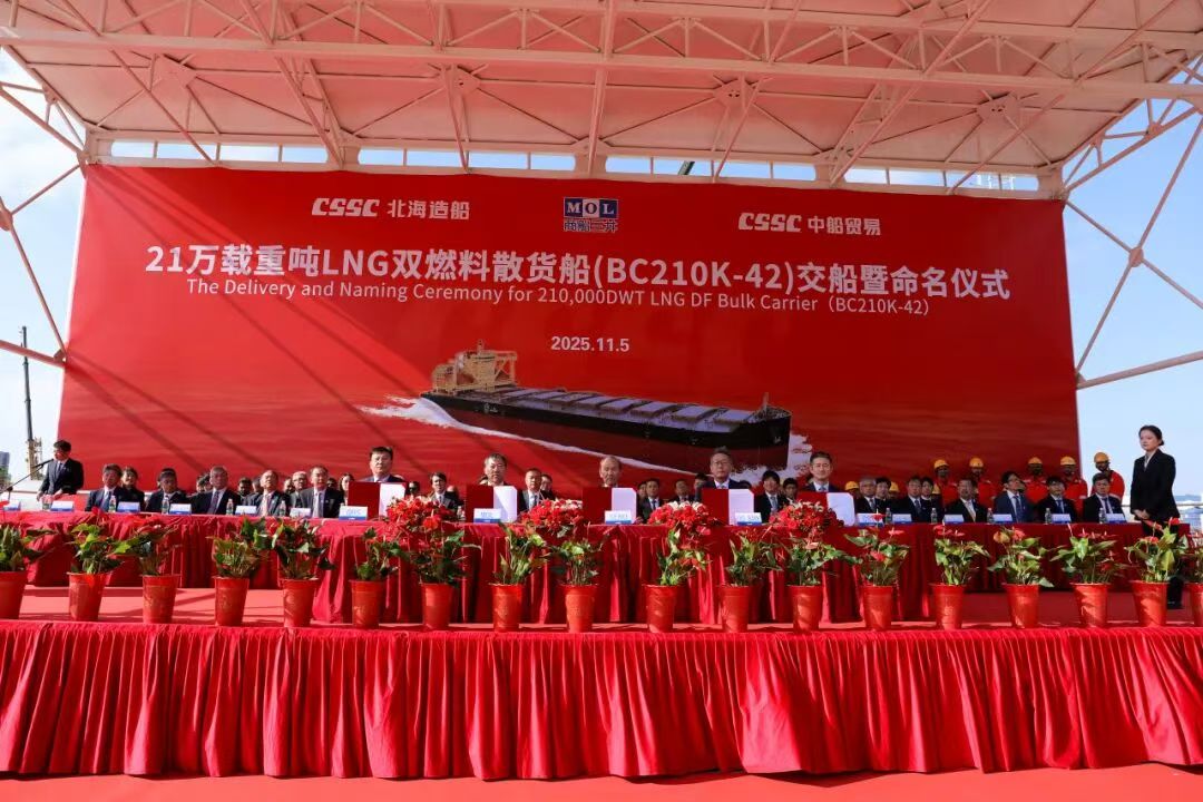 On November 5, China State Shipbuilding Corporation Beihai Shipbuilding, in collaboration with China Shipbuilding Trading Co., Ltd. (CSTC), held the delivery and naming ceremony for the fourth 210,000 DWT LNG dual-fuel bulk carrier “RURI EARTH”, custom-built for Mitsui O.S.K. Lines (MOL).