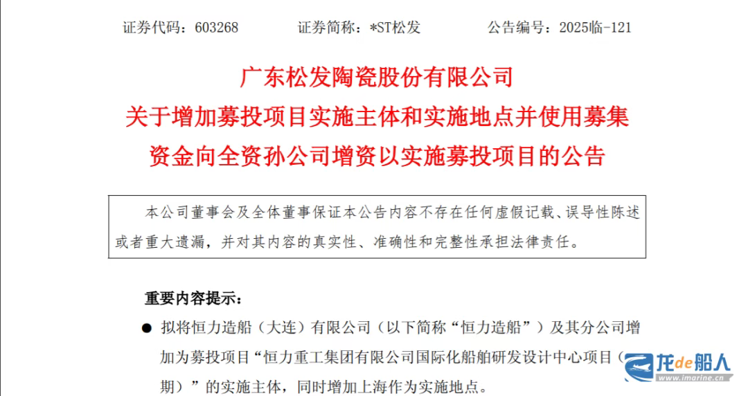 As disclosed in the announcement, *ST Songfa reviewed and approved the proposal at the 6th Meeting of the 7th Board of Directors held on November 10, 2025. The proposal agrees to add Hengli Shipbuilding (Dalian) Co., Ltd. (hereinafter referred to as “Hengli Shipbuilding”) and its branches as the implementing entities of the raised capital investment project – “Hengli Heavy Industries Group Co., Ltd. International Ship R&D and Design Center Project (Phase I)”. Meanwhile, Shanghai is added as an additional implementation location, and Hengli Heavy Industries shall use the raised funds to increase capital in Hengli Shipbuilding for the implementation of the said project.