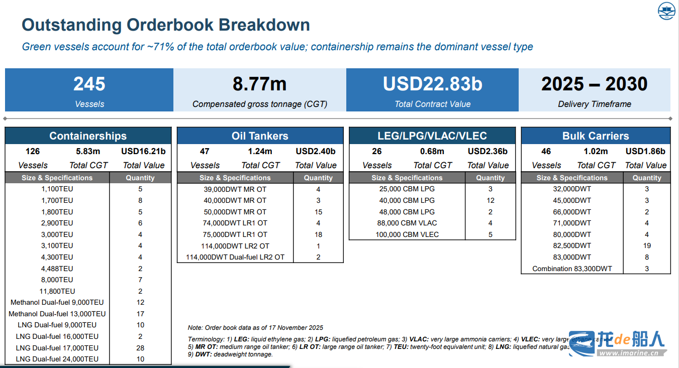 On November 17, China’s largest private shipbuilder Yangzijiang Shipbuilding Group released its third-quarter performance report for 2025. As of September 30, 2025, the Group’s order backlog reached 8.77 million compensated gross tonnage(CGT, 245 vessels) with a total value of US$22.83 billion, extending delivery schedules through 2030. New orders secured included 50 vessels valued at $2.17 billion, comprising 38 container ships, 10 bulk carriers, and 2 gas carriers.