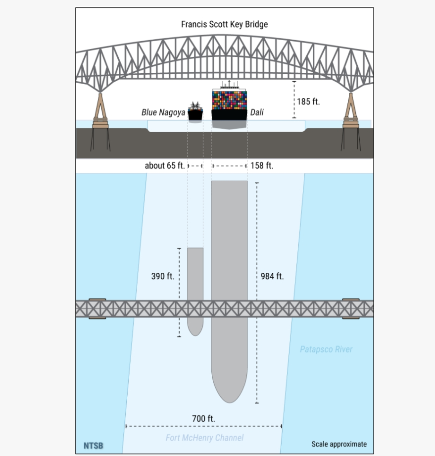 The comparative sizes of the Blue Nagoya and the Dali relative to the Key Bridge. (Source: NTSB)