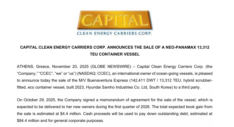Capital Clean Energy Carriers Corp., an international shipping company, is one of the world’s leading platforms of gas carriage solutions with a focus on energy transition. CCEC’s in-the-water fleet includes 14 high specification vessels, including 12 latest generation LNG carriers (“LNG/Cs”) and two legacy Neo-Panamax container vessels, one of which has been agreed to be sold. In addition, CCEC’s under-construction fleet includes six additional latest generation LNG/Cs, six dual-fuel medium gas carriers and four handy LCO2/multi-gas carriers, to be delivered between the first quarter of 2026 and the third quarter of 2027.