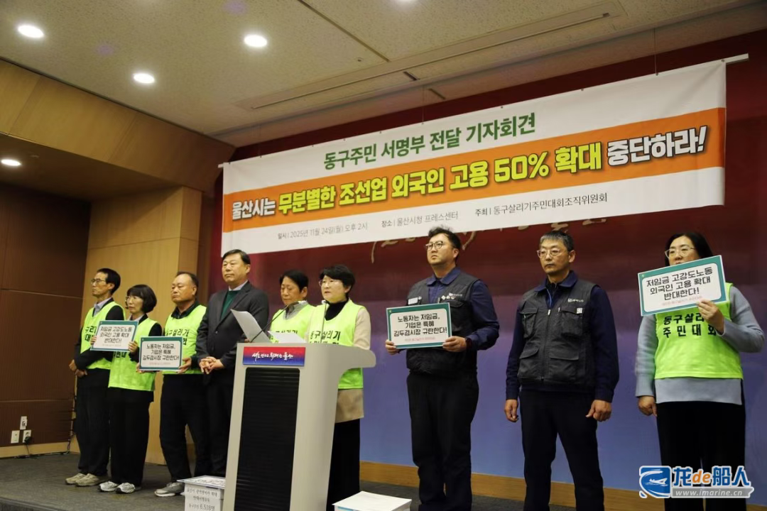 On November 24th, residents of Ulsan City and local South Korean shipyard workers held a press conference to oppose the plan of Ulsan Mayor Kim Du-cheon (transliterated) to expand the special visa quota for foreign workers.