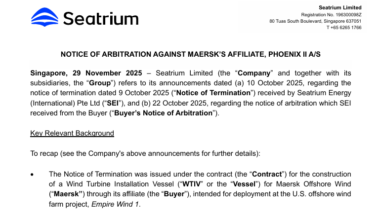 On November 29, Seatrium announced on its official website that, in accordance with the current terms of the London Arbitration Association, its subsidiary Seatrium Energy International (SEI) initiated arbitration proceedings against Maersk affiliate PHOENIX II A/S (hereinafter referred to as the “Buyer”) on November 28.