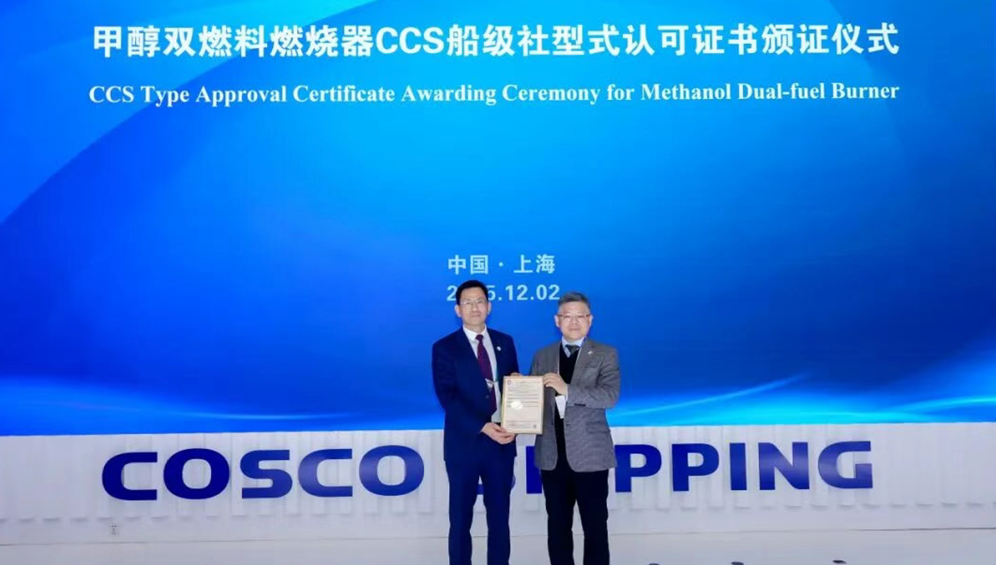 Recently, Nantong Ocean Ship Equipment/COSCO SHIPPING Heavy Industry Technology (Weihai) (CHIT) officially unveiled the “Blue Ocean Shield” methanol dual-fuel burner and successfully obtained the world’s first type approval certificate for this product from the China Classification Society (CCS). The company successfully obtained the world’s first type approval certificate for this product issued by CCS, marking another significant breakthrough by Nantong Ocean Ship Equipment/CHIT has achieved another significant breakthrough in the field of key equipment for methanol-powered vessels.