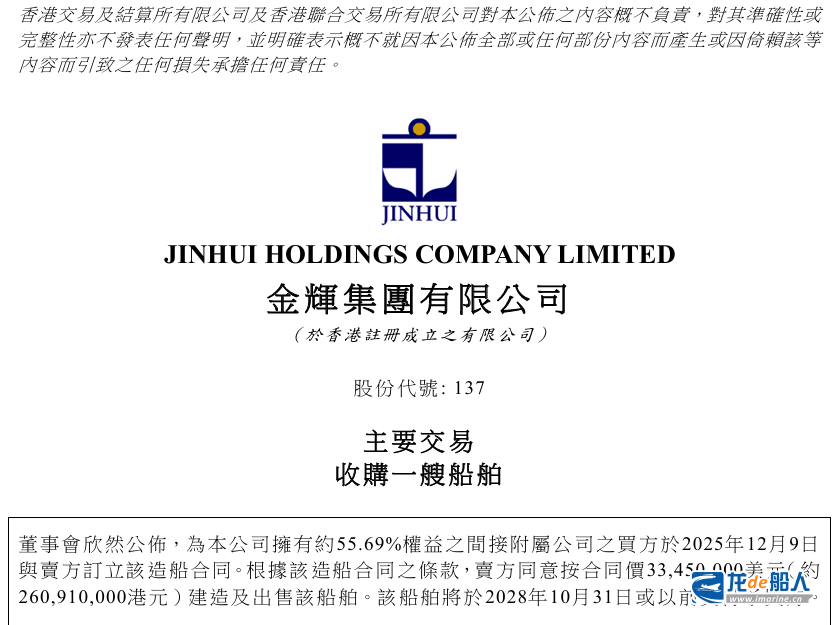 On December 10, Jinhui Holdings announced in its “Major Transaction – Acquisition of a Vessel” notice that on December 9, an indirect subsidiary in which the company holds a 55.69% interest entered into a construction contract with Jiangmen Nanyang Ship Engineering for a 64,500 DWT bulk carrier.