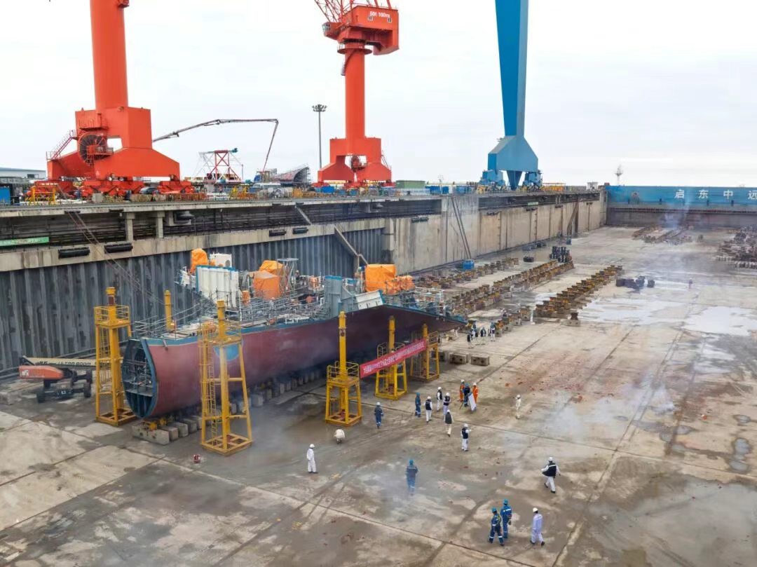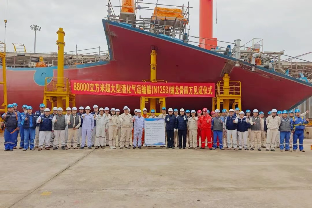 On December 10th, COSCO SHIPPING (Qidong) Offshore held a keel-laying ceremony for the N1253 88,000 m³ ultra-large liquefied gas carrier (abbreviated as 88K VLGC), marking the official entry of the project into the hull assembly phase.