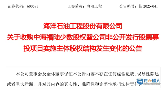 On December 19, China Offshore Oil Engineering Co., Ltd. (COOEC) issued the “Announcement on the Acquisition of a Minority Equity Interest in CNOOC Fulu Heavy Industry and Changes to the Equity Structure of the Implementing Entity for the Company’s Non-Public Offering of Shares for Investment Projects.”