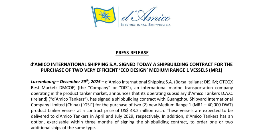 These vessels are expected to be delivered to d’Amico Tankers in April and July 2029, respectively. In addition, d’Amico Tankers has an option, exercisable within three months of signing the shipbuilding contract, to order one or two additional ships of the same type.
