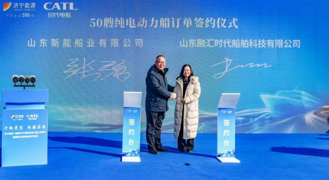 On December 29, 2025, Ningde Times Electric Boat Technology Co., Ltd. (CATL) and Jining Energy Development Group held a signing ceremony for pure electric cargo ship orders and a batch delivery ceremony in Jining. During the ceremony, the first five 67.6-meter pure electric cargo ships jointly developed by the two parties were successfully launched. Simultaneously, both parties completed the batch signing for 50 ships.