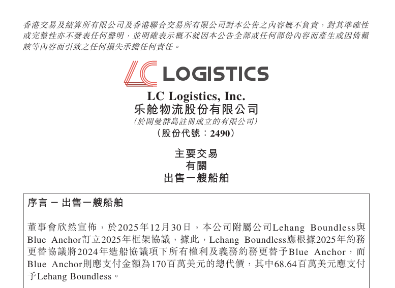 On December 30, 2025, LC Logistics Inc. announced that its subsidiary Lehang Boundless entered into a 2025 Contract Transfer Agreement with new shipowner Blue Anchor, shipyard representative China Shipbuilding Trading Co., Ltd. (CSTC) and Jiangnan Shipyard. Blue Anchor will replace Lehang Boundless as the buyer under the 2024 shipbuilding agreement.