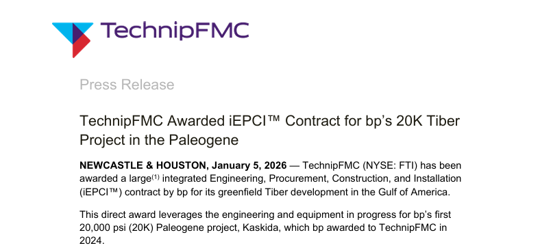 This direct award leverages the engineering and equipment in progress for bp’s first 20,000 psi (20K) Paleogene project, Kaskida, which bp awarded to TechnipFMC in 2024.
