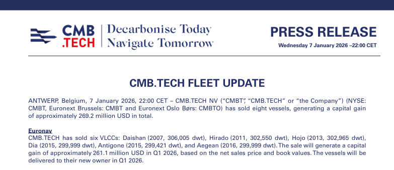 CMB.TECH stated that based on the comparison between the net sales price and book value, the aforementioned six VLCCs are expected to be delivered to new owners in the first quarter of 2026. This sale is projected to generate approximately $261.1 million in capital gains.