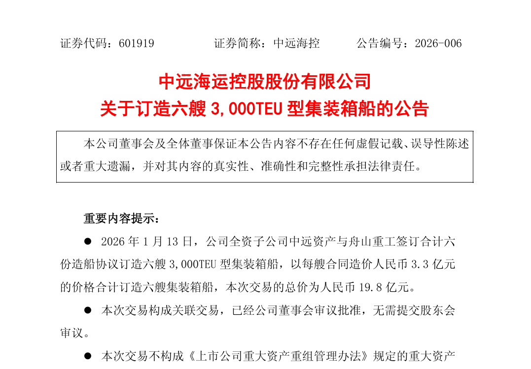 The announcement disclosed that the two parties signed an agreement to order six new 3,000 TEU wide-body conventional fuel-powered container ships at a price of RMB 330 million each, which are scheduled to be delivered in batches between June and December 2028.