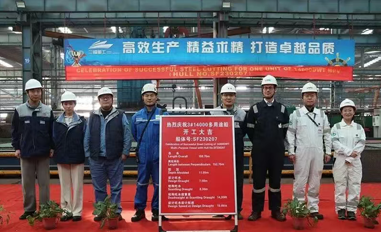 On January 14, Sanfu Shipbuilding held a steel-cutting ceremony in its steel fabrication workshop for a 14,000 DWT multi-purpose vessel being built for a German shipowner.