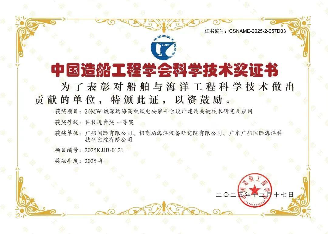 Recently, the evaluation results of the 2025 Science and Technology Award of the Chinese Society of Naval Architects and Marine Engineers (CSNAME) have been officially announced. The project Research and Application of Key Technologies for the Design and Construction of 20MW-Class High-Efficiency Offshore Wind Power Installation Platforms, led by CSSC Guangzhou Shipyard International (GSI), has won the First-Class Award for Science and Technology Progress.
