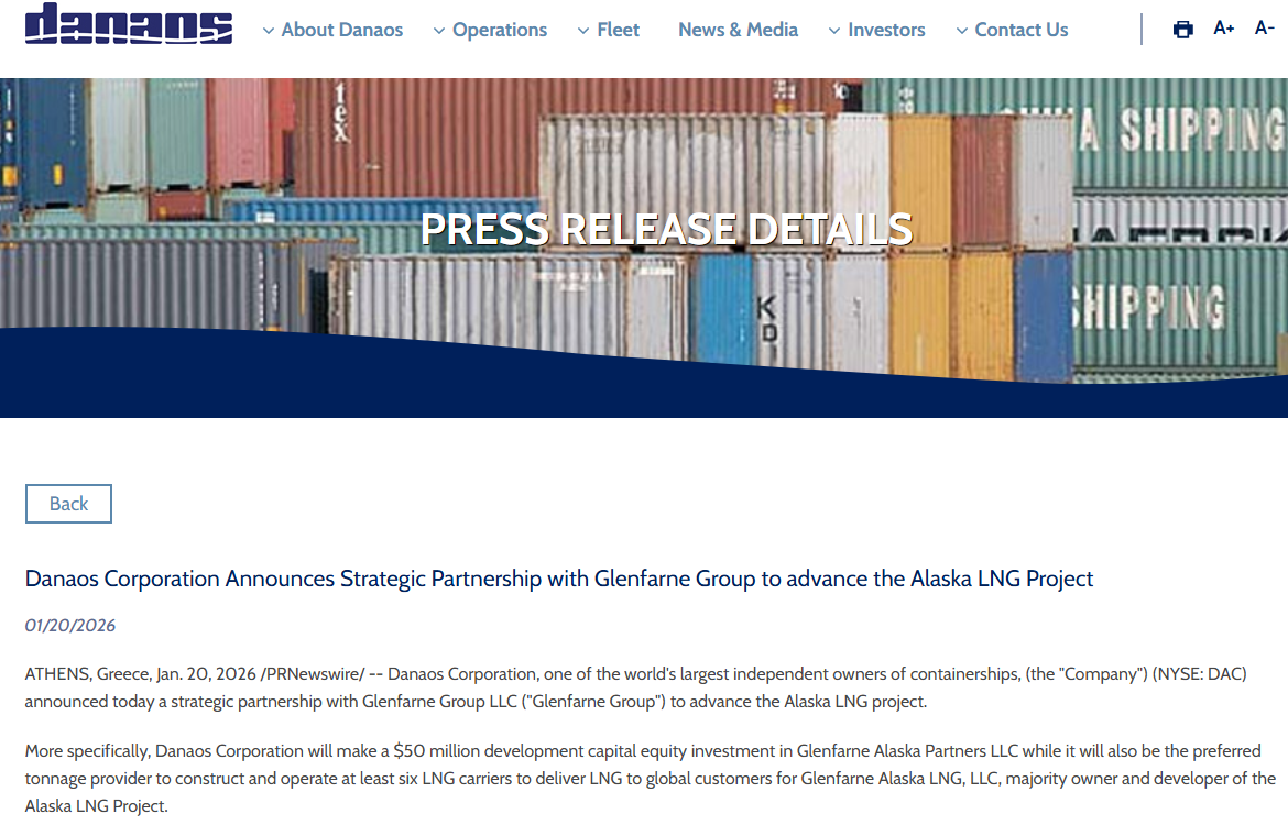 More specifically, Danaos Corporation will make a $50 million development capital equity investment in Glenfarne Alaska Partners LLC while it will also be the preferred tonnage provider to construct and operate at least six LNG carriers to deliver LNG to global customers for Glenfarne Alaska LNG, LLC, majority owner and developer of the Alaska LNG Project.