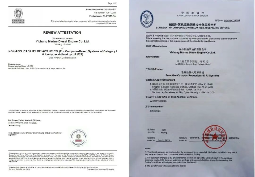 Recently, the High-Pressure Selective Catalytic Reduction Control System (HPSCR) independently developed by CSSC Engine Co., Ltd. (CSE) has successfully obtained the Marine Computer System Cybersecurity Low-Risk Exemption Certificate. It has passed the review and approval of the China Classification Society (CCS) and Bureau Veritas (BV) by virtue of its stable and reliable operational performance.