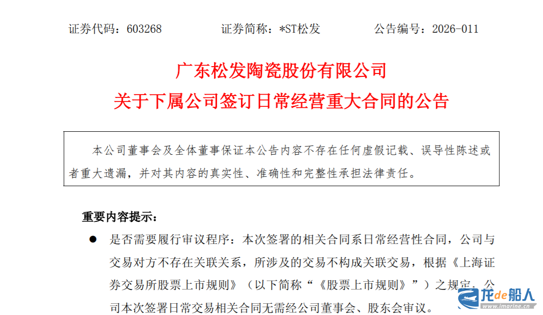 On January 29, *ST Songfa, the listed entity of Hengli Heavy Industries, issued an announcement regarding a major daily business contract signed by its subsidiary, Hengli Shipbuilding (Dalian) Co., Ltd., which announced that the contract for the construction of two 306,000 DWT Very Large Crude Carriers (VLCCs) had recently been signed and taken effect.