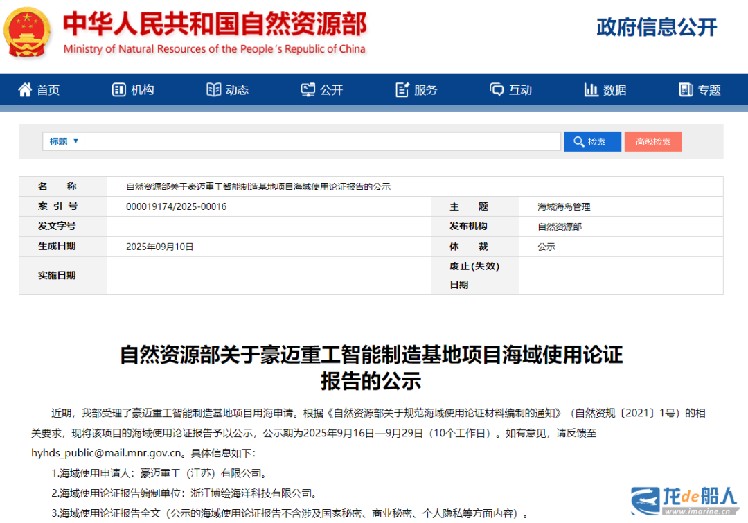 The Ministry of Natural Resources announced in September 2025 that it had formally accepted Haomai Heavy Industry’s application for maritime use, and granted the company a maritime use property rights certificate in January 2026.