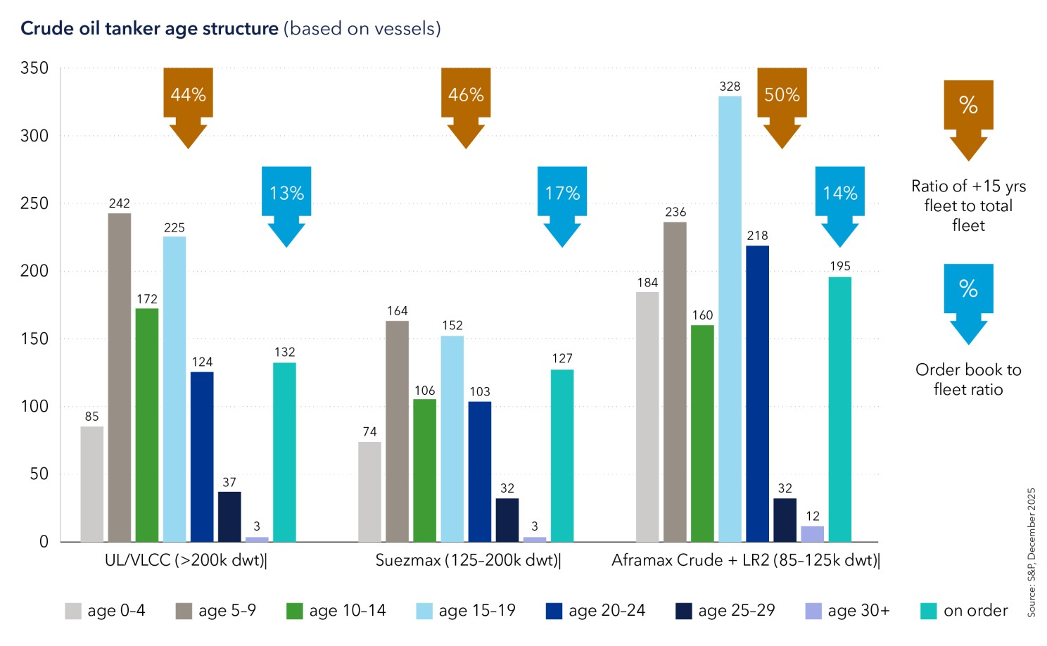 This shift comes against the backdrop of an ageing global fleet. By the end of 2025, 23% of all tankers were over 20 years old, and 45% were 15 years or older, up from 36% a decade ago. In the crude segment, 40% of VLCCs and Suezmaxes are now older than 15 years, while in the Aframaxes segment the ratio is over 45%.