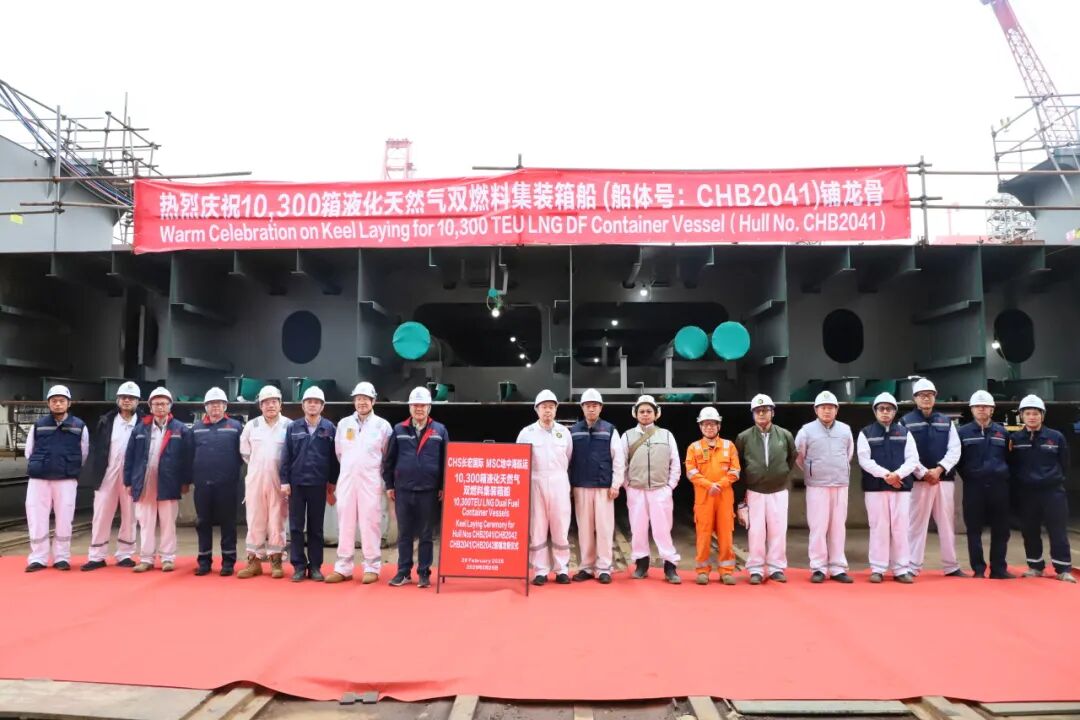 On February 26, Zhoushan Changhong International held a keel-laying ceremony at Dock #1 for two 10,300 TEU LNG dual-fuel container ships (Hull Nos.: CHB2041/CHB2042) constructed for Mediterranean Shipping Company (MSC). This marks the project’s official entry into the slipway construction phase.