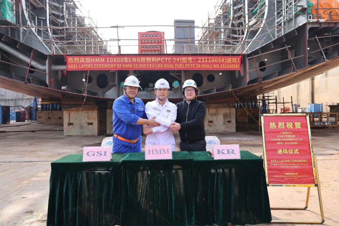 On February 25, China State Shipbuilding Corporation’s Guangzhou Shipyard International, in collaboration with China Shipbuilding Trading Co., Ltd. (CSTC), successfully laid keel for the second 10,800 CEU LNG dual-fuel PCTC constructed for South Korea’s Hyundai Merchant Marine (HMM).