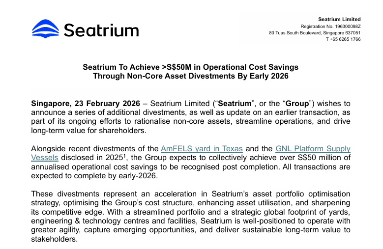 Alongside recent divestments of the AmFELS yard in Texas and the GNL Platform Supply Vessels disclosed in 2025, the Group expects to collectively achieve over S$50 million of annualised operational cost savings to be recognised post completion. All transactions are expected to complete by early-2026.