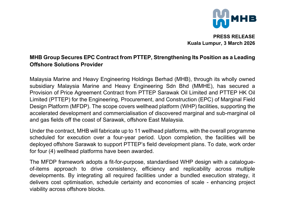 On March 3, Malaysia Maritime and Heavy Industries Holdings Berhad (MHB) announced via its official website that its wholly-owned subsidiary, Malaysia Marine and Heavy Engineering Sdn Bhd (MMHE), has been awarded the Engineering, Procurement, and Construction (EPC) contract for the Marginal Field Design Platform (MFDP) project by PTTEP Sarawak Petroleum Company Limited and PTTEP Hong Kong Petroleum Company Limited, subsidiaries of the PTT Exploration and Production Public Company Limited (PTTEP).